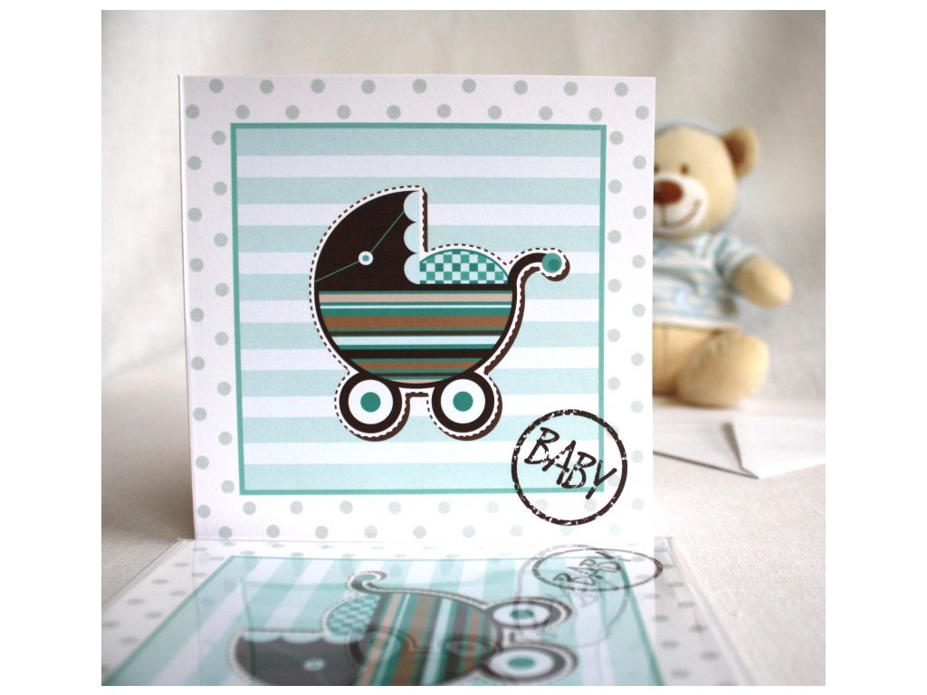 Blahopřání k narození chlapečka. Přání je zabaleno společně s bílou obálkou v průhledném obalu. Je otevírací, bez textu uvnitř.