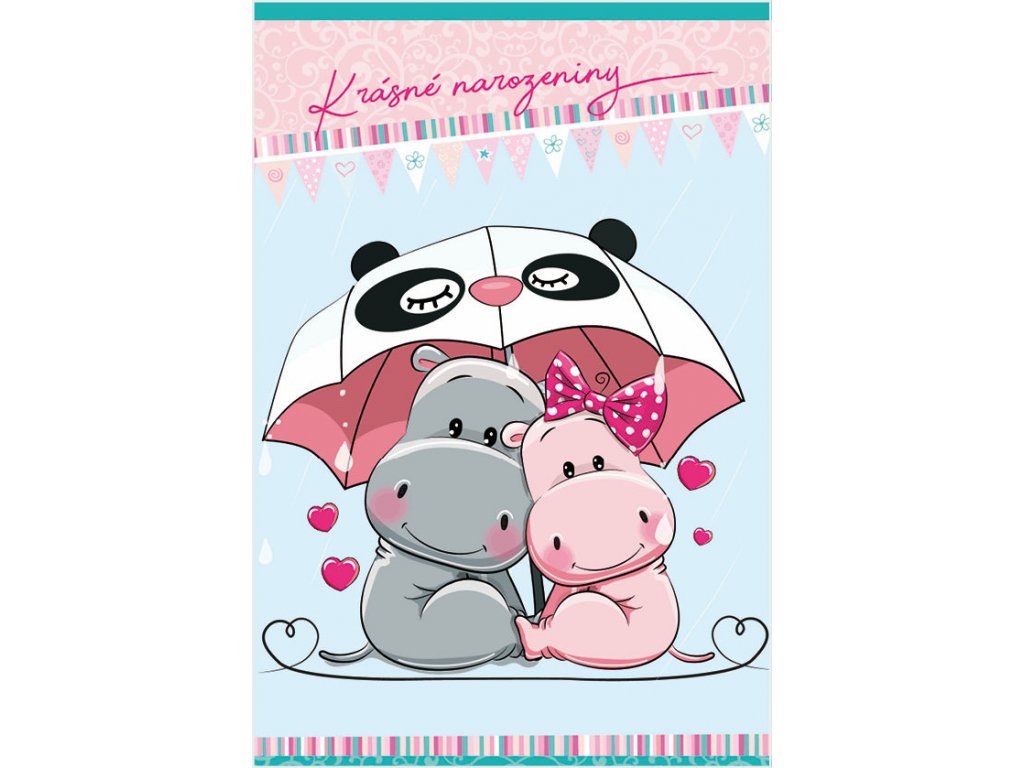 Blahopřání k narozeninám včetně bílé obálky. Přání je uvnitř stejně barevné jako přední strana, na levé straně je v rohu dvojice hrošíků pod deštníkem. Bez vnitřního textu.