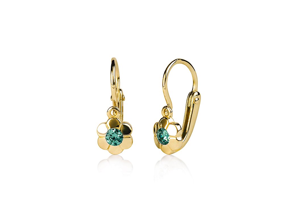 Dětské náušice - kytičky ze žlutého zlata se zeleným zirkonem