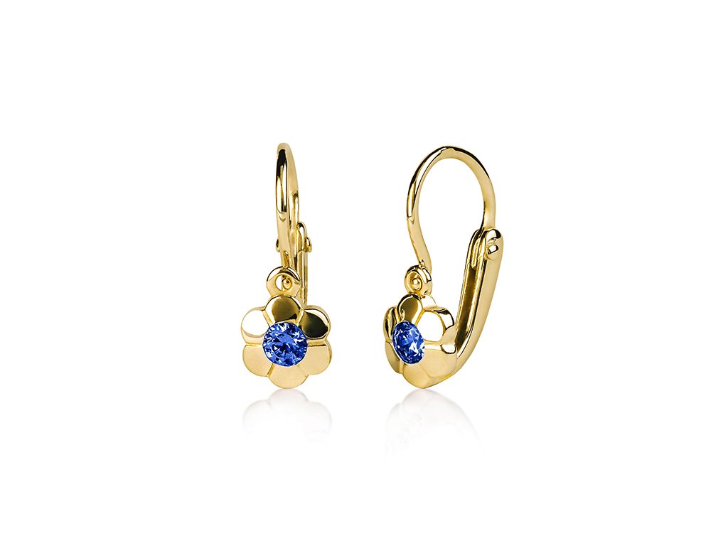 Dětské náušnice - kytičky ze žlutého zlata s tmavě modrým zirkonem