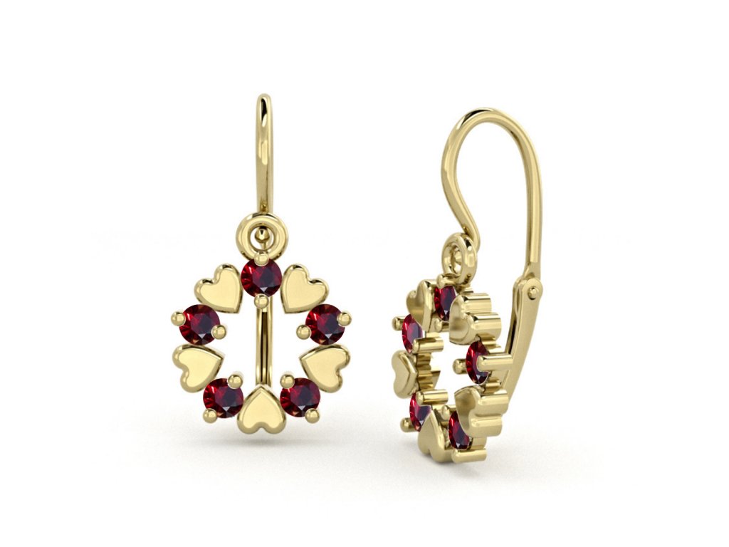 Dětské náušnice ze žlutého zlata - kolečka z červených zirkonů a zlatých srdíček.