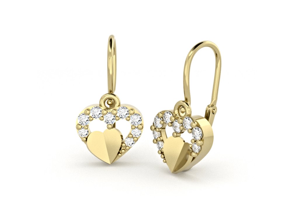 Dětské náušnice ze žlutého zlata - srdíčka po obvodu vykládaná drobnými čirými zirkony. Náušnice zdobí malé zlaté srdíčko.