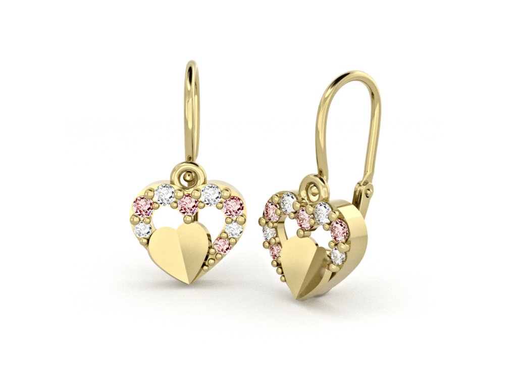 Dětské náušnice ze žlutého zlata - srdíčka po obvodu vykládaná drobnými světle růžovými a čirými zirkony. Náušnice zdobí malé zlaté srdíčko.