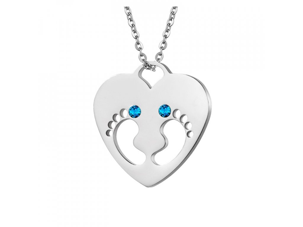 Náhrdelník z chirurgické oceli, který tvoří řetízek a přívěsek - dětské nožičky v srdíčku. Přívěsek je zdobený modrými krystaly Swarovski.
