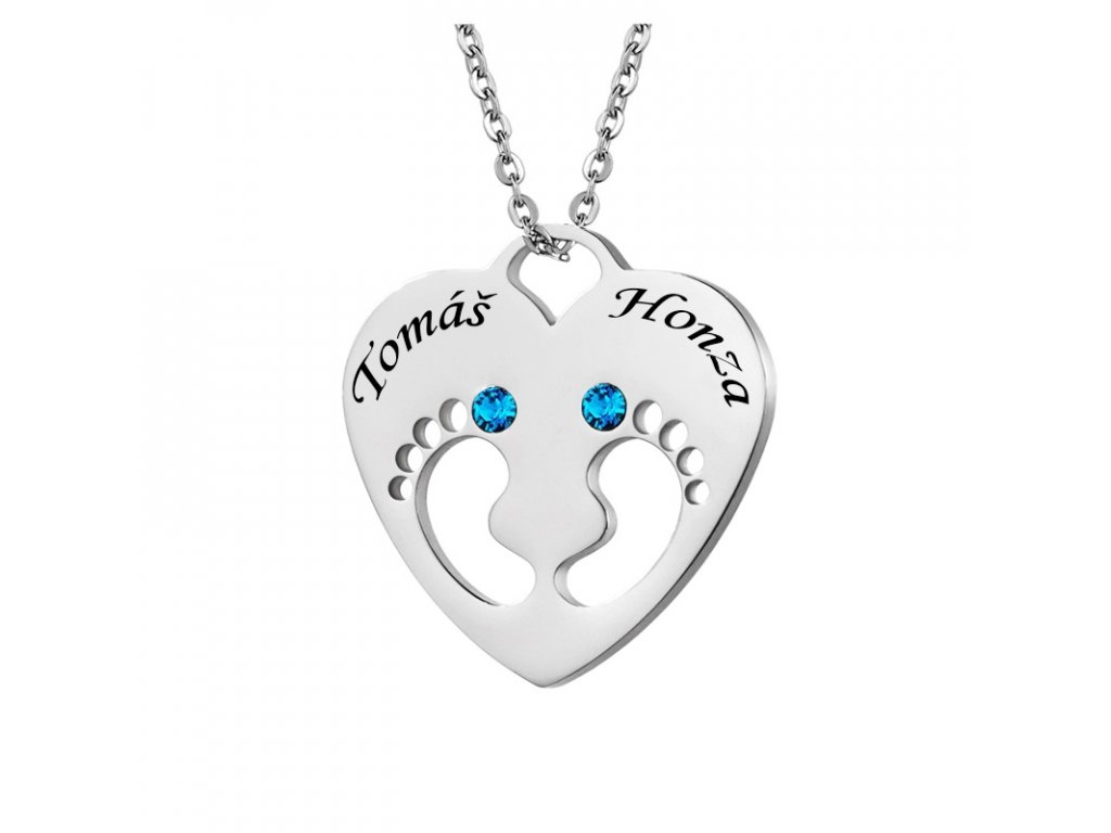 Náhrdelník pro maminku z chirurgické oceli - dětské nožičky v srdíčku s modrými krystaly Swarovski