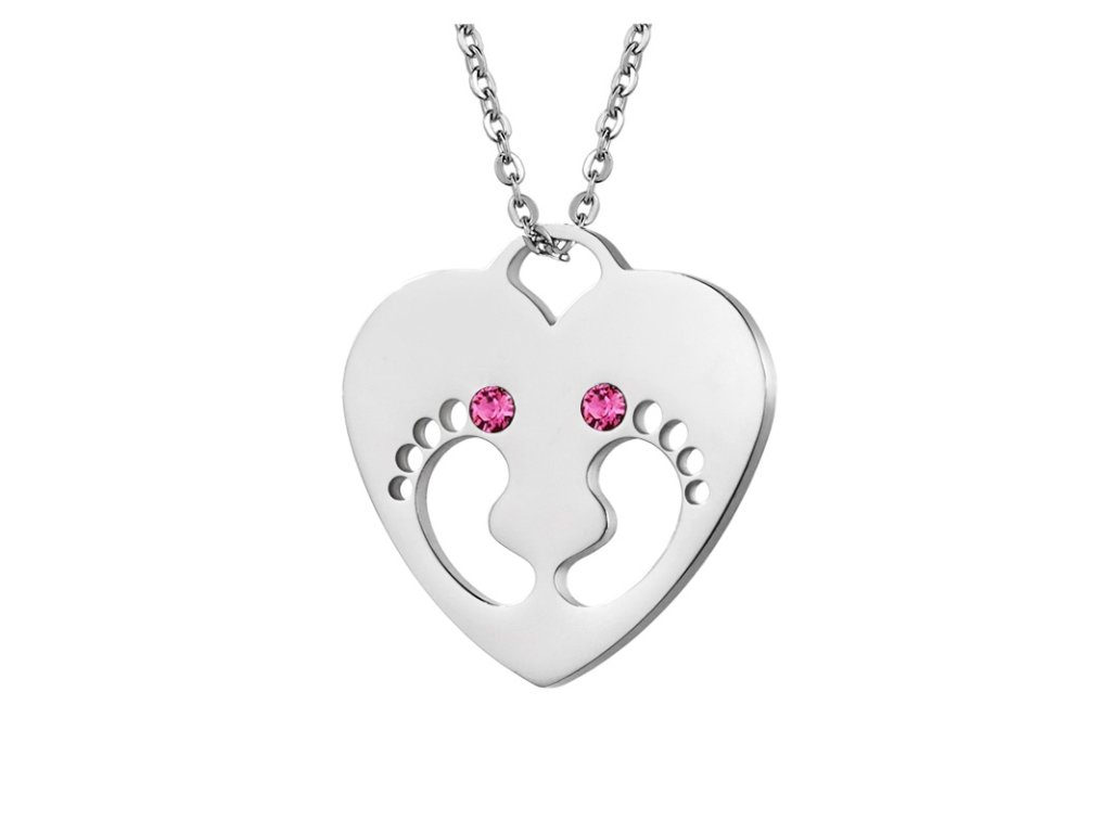 Náhrdelník z chirurgické oceli, který tvoří řetízek a přívěsek - dětské nožičky v srdíčku. Přívěsek je zdobený růžovými krystaly Swarovski.