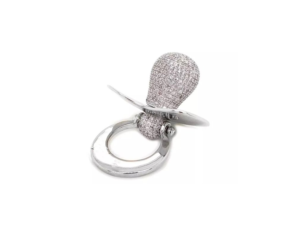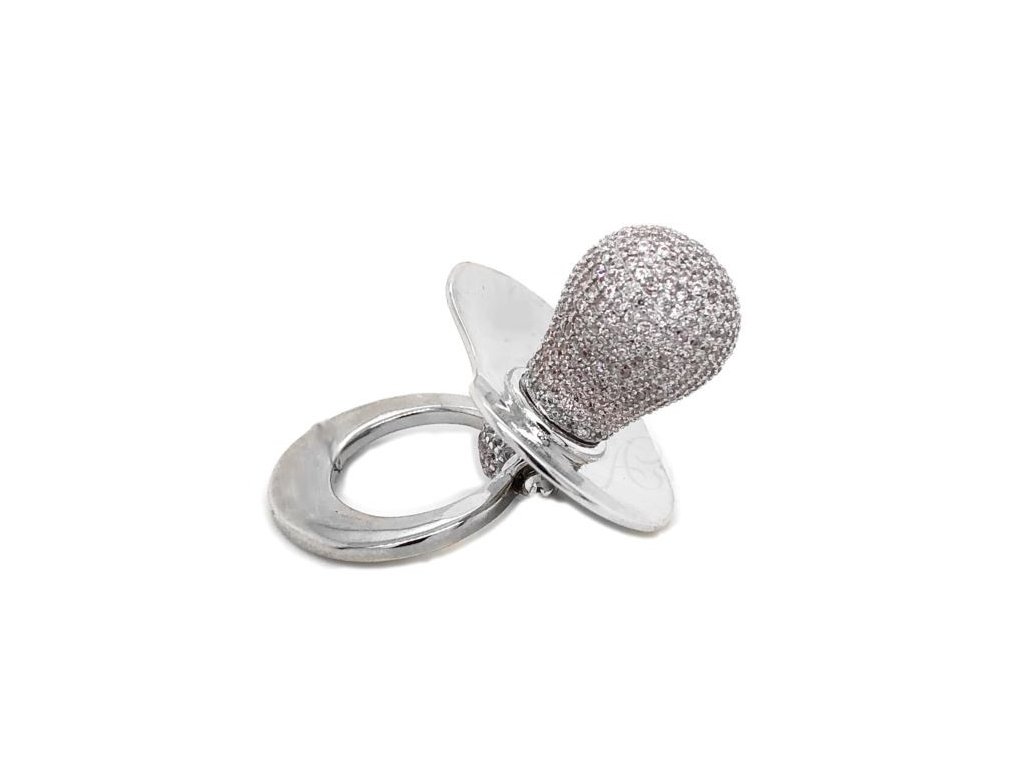 Stříbrný dudlík zdobený čirými zirkony. Tento krásný dárek pro miminko dodáváme v dárkové krabičce. Do rámečku Poznámka k produktu (nahoře pod cenou) nebo do poznámky v objednávce uveďte prosím, zda si přejete světle růžovou nebo světle modrou krabičku.